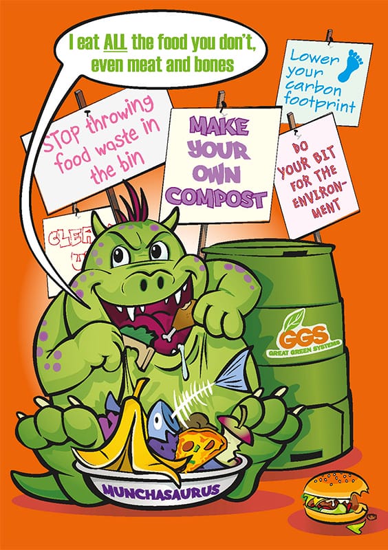 Deborah Gray asked Longbow to help with branding the business and subsequently designing promotional material. Deborah wanted this to appeal to all family members, including children, so Longbow created a cartoon character of a waste food-eating monster – the Munchasaurus. As well as appearing on promotional material, the Munchasaurus was also produced as a large cutout display figure that stood at campaign locations such as supermarkets.