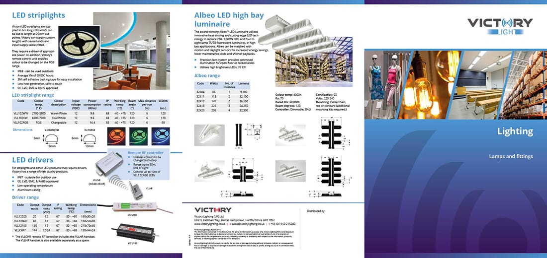 With a technical product range such as Victory’s, clearly presented product data is essential and Longbow’s mission was to produce a complete range of product brochures, datasheets and flyers that were visually attractive, as well as presenting Victory’s clear technical data. Victory is an international business and much of the product literature was produced in multiple languages.