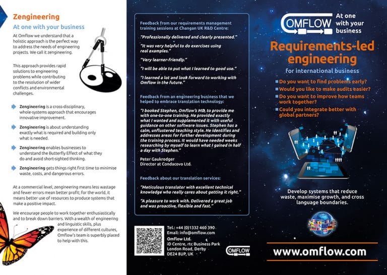 This flyer was produced as part of a branding project for engineering consultants Omflow Ltd. The company operates in Germany, China and the UK. Longbow created literature, roller banners and a website in English, Chinese and German. The leaflet was produced as a 6PP DL with roll fold.